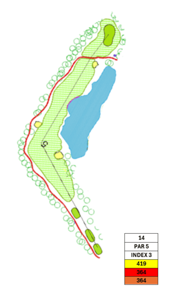 Bij deze hole is het belangrijk om in de buitenbocht te blijven. Het gedeelte net na de bocht verdient aandacht, omdat het smaller wordt. Ideaal zou zijn wanneer u ca. 60 meter over houdt richting de green en mik dan op het midden of een beetje rechts op de green.
