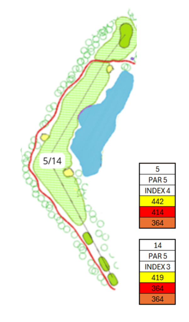 Zeker geen lange par 5 maar met genoeg uitdaging. Het tee shot kan over de bunker in de binnenbocht en dan is de green in 2 slagen te bereiken. Let op bij een eventuele lay-up dat u links aanhoudt.