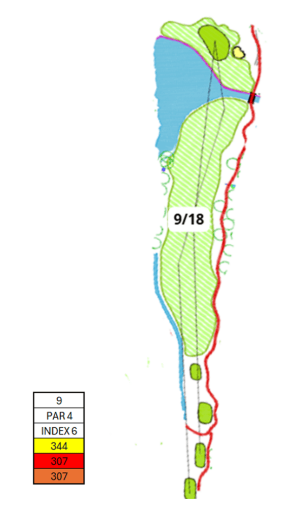 De buitenbocht heeft de voorkeur, hier is de hole qua zicht het breedst en blijft u uit de buurt van het gevaar. Met een goede tweede slag, waarbij rekening gehouden moet worden met de sloot, kunt u wellicht met 3 slagen in de buurt van de green komen.